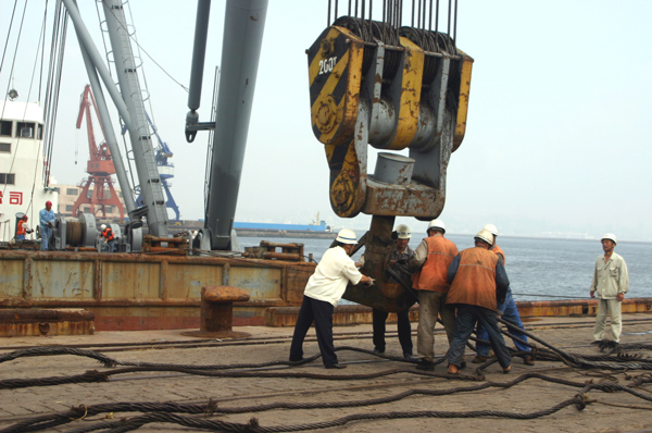 由于門機不能起吊這樣的大型設備,所以有關部門聯系到海吊,進行裝船作業。不要以為海吊來了就萬事大吉了,往這個負荷200T的大鉤頭上掛鋼絲繩就十分麻煩。