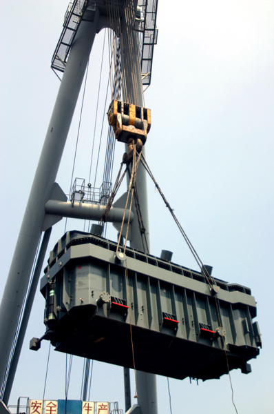 在拖輪和絞車的幫助下,海吊吊著設備離開岸臂,向大船靠攏,準備向船艙內放下設備。在指揮手的指揮下,緩緩落下設備。