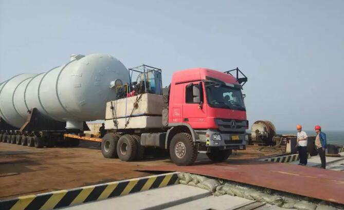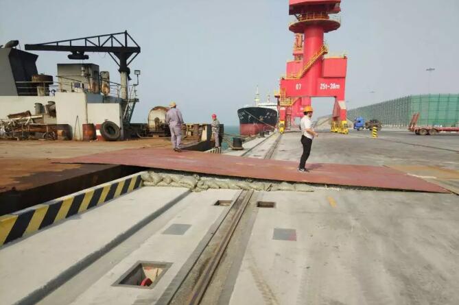 為做好首次大件設備接卸工作,集團公司高度重視,認真謀劃,先后召開3次裝卸流程技術調度會。結合碼頭承臺結構,積極制定船舶靠泊、護輪坎及軌道防護方案,準確核算碼頭前沿承載負荷,并根據潮汐情況確定最佳的卸船時間,保證了貨物的安全接卸。