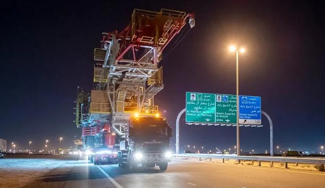 運(yùn)輸前需要進(jìn)行的準(zhǔn)備工作包括對(duì)道路基礎(chǔ)設(shè)施進(jìn)行改造,臨時(shí)替換100多個(gè)路燈和交通信號(hào)燈,建造臨時(shí)橋梁以保護(hù)地下電纜和管道。每個(gè)鉆機(jī)包括三個(gè)主要部分和三個(gè)較小的部分,重量從147噸到471噸不等。它們?cè)诮茇惏⒗镒杂蓞^(qū)的制造廠用大件運(yùn)輸車運(yùn)輸至杰貝阿里港,然后在港口裝載到Mammoet駁船上,再通過水路運(yùn)輸?shù)桨⒙W詈笤诙趴四犯劢邮詹⒀b載進(jìn)行陸運(yùn),鉆機(jī)段被運(yùn)送到Nimr現(xiàn)場(chǎng)400公里。