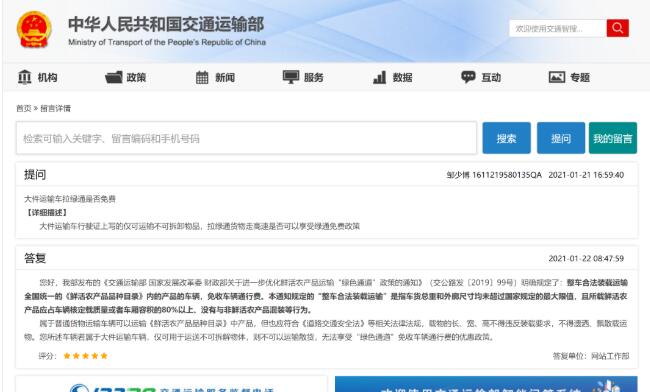 交通運輸部官方網站在留言咨詢欄,對該問題進行了答復。
