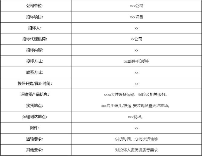 大件的發運的企業在招標文件中應標明所運物件的主要參數指標,如形狀、長、寬、高、重量、重心等,標明運輸的起始地和目的地,還要包括投標者為投標所需了解和遵守的有關規定,及為承運商投標、報價所需提供的文件和資料。